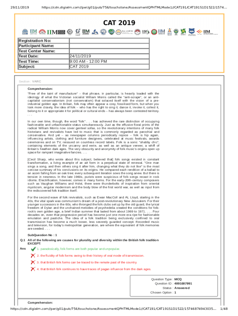 HTTPS://cdn.digialm.com//per/g01/pub/756/touchstone/AssessmentQPHTMLMode1//CAT191/CAT191S1D1522/157429/11/2019Registration No: Participant Name: Test Center Name: Test Date: Test Time: Subject:24/11/2019