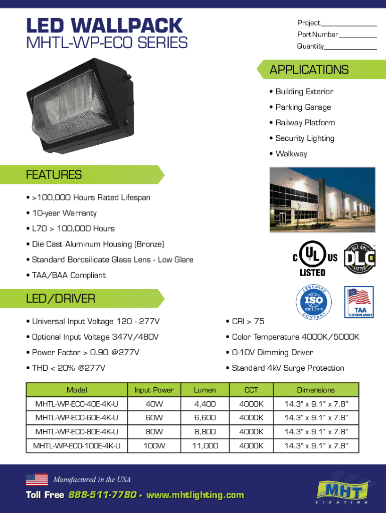 LED WALLPACKProject ___ Part Number ___ Quantity ___MHTLWPECO SERIESAPPLICATIONS Building Exterior Parking Garage Railway Platform Security Lighting WalkwayFEATURES 100,000 Hours Rated Lifespan 10year