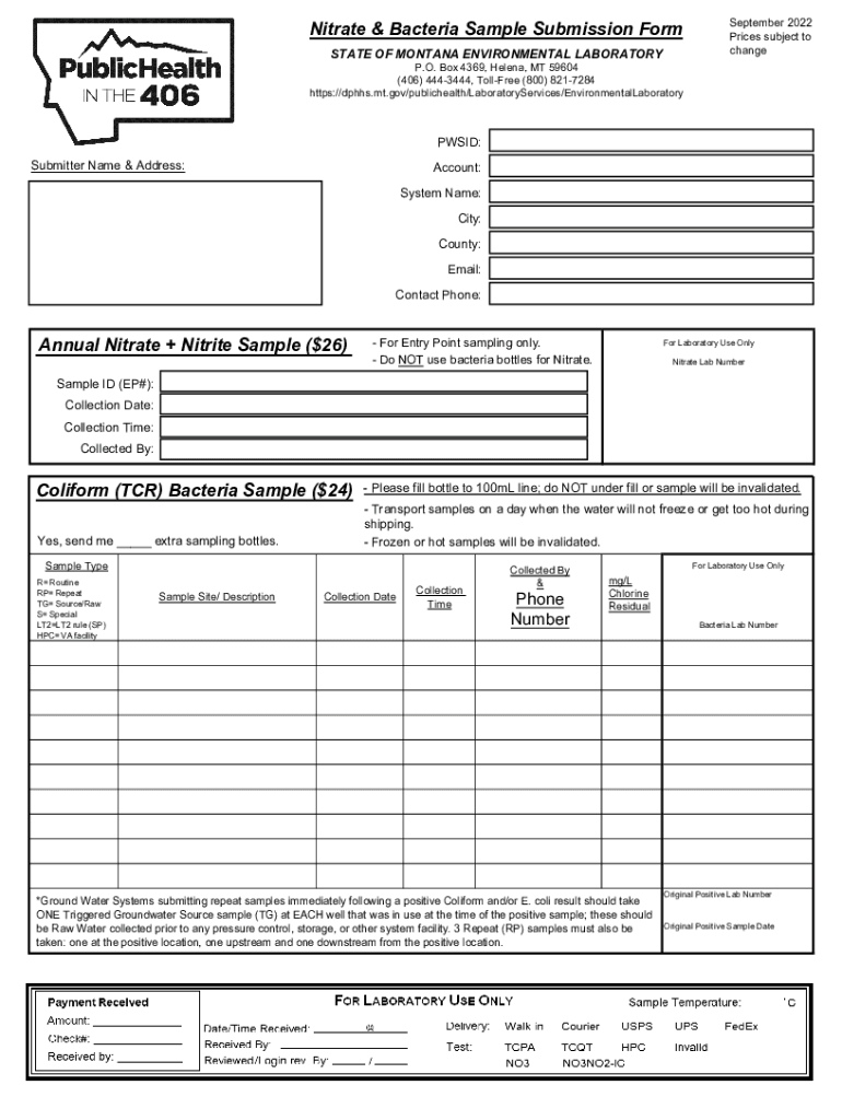 Nitrate & Bacteria Sample Submission Form STATE OF MONTANA ENVIRONMENTAL LABORATORY September 2022 Prices subject to change. O. Box 4369, Helena, MT 59604 (406) 4443444, Toll-free (800) 8217284 https://dphhs.mt.gov/publichealth/LaboratoryServices/EnvironmentalLaboratoryPWSID: