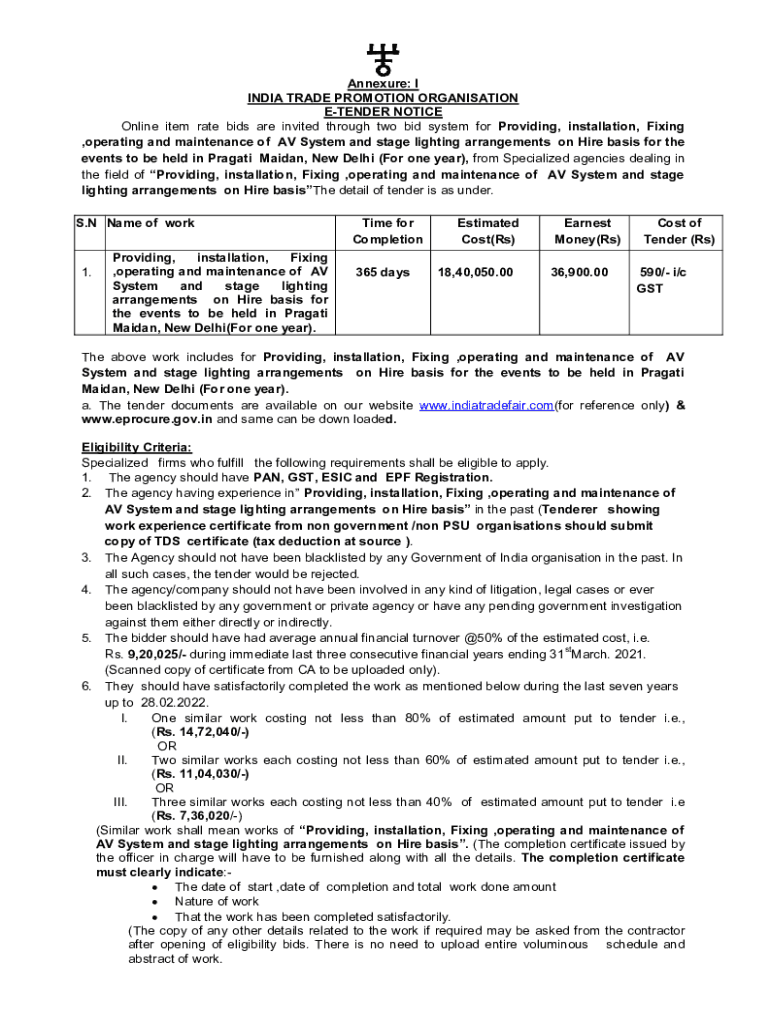 Appendix: I INDIA TRADE PROMOTION Organization TENDER NOTICE Online item rate bids are invited through two bid system for Providing, installation, Fixing, operating and maintenance of AV System and