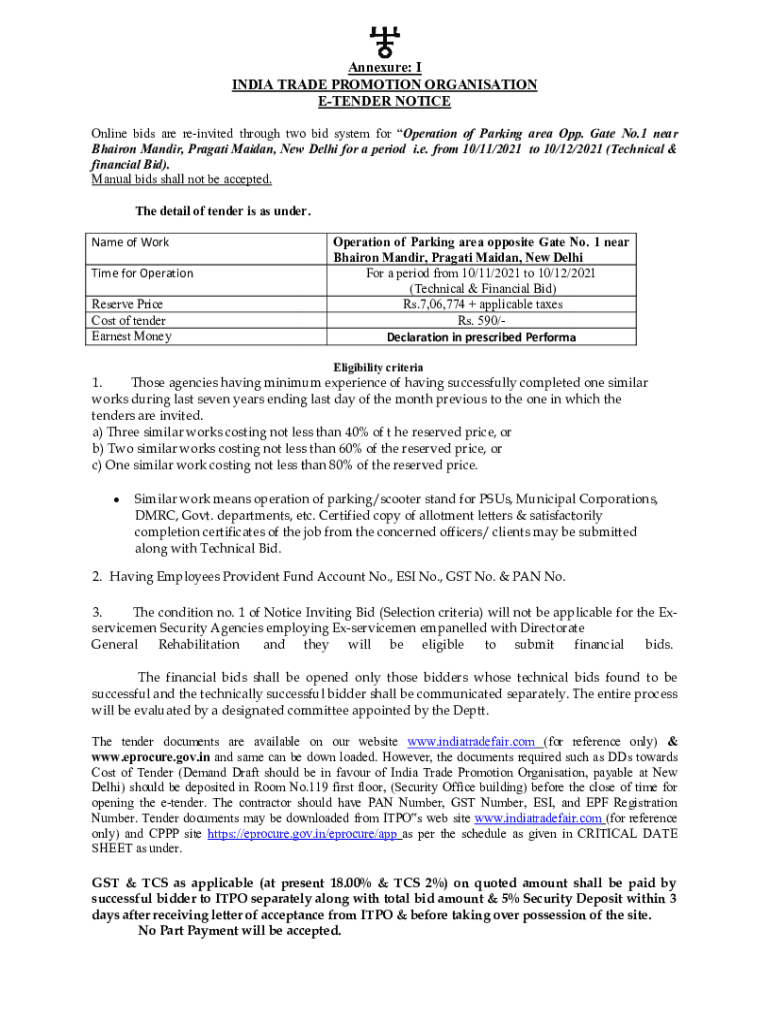 Appendix: I INDIA TRADE PROMOTION Organization TENDER NOTICE Online bids are reinvited invited through two bid system for Operation of Parking area Opp. Gate No.1 near Thereon Manner, Pragmatic Maidan,