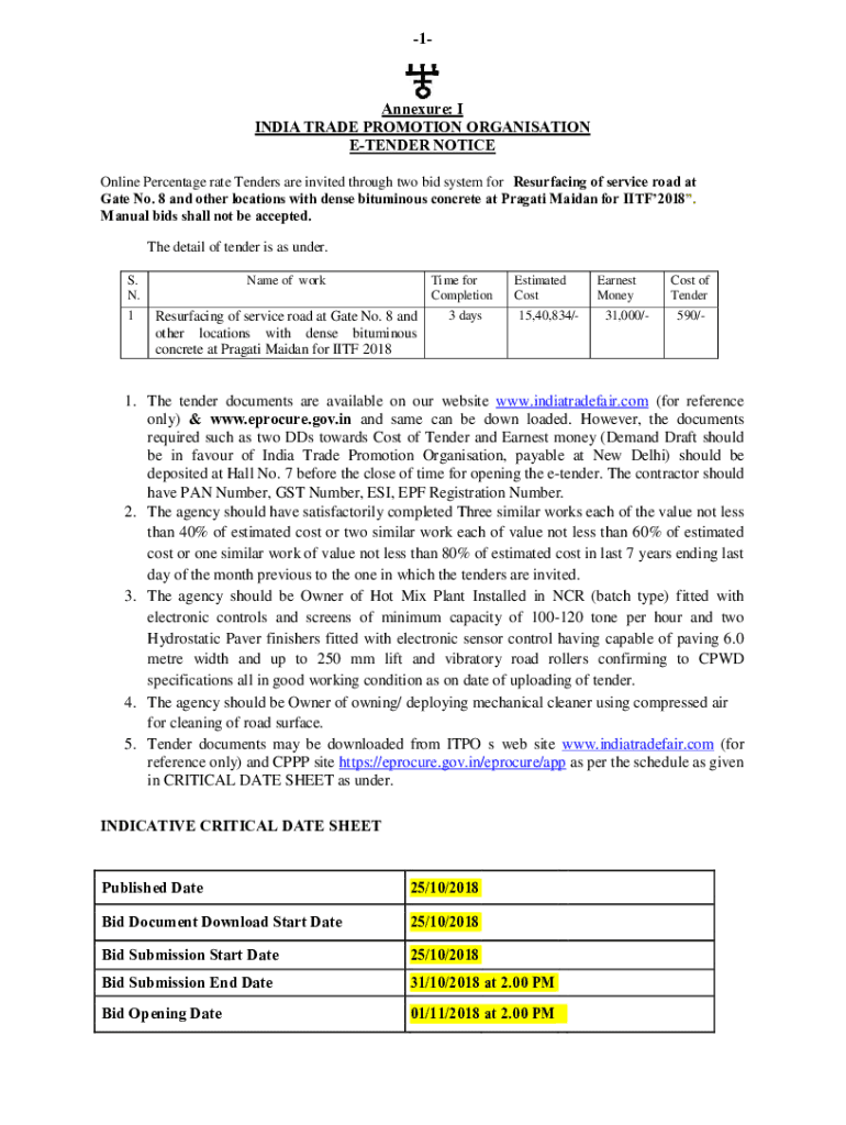 1Annexure: I INDIA TRADE PROMOTION Organization TENDER NOTICE Online Percentage rate Tenders are invited through two bid system for Resurfacing of service road at Gate No. 8 and other locations with