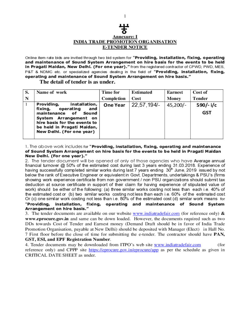 1Annexure: I INDIA TRADE PROMOTION Organization TENDER NOTICE Online item rate bids are invited through two bid system for Providing, installation, fixing, operating and maintenance of Sound System