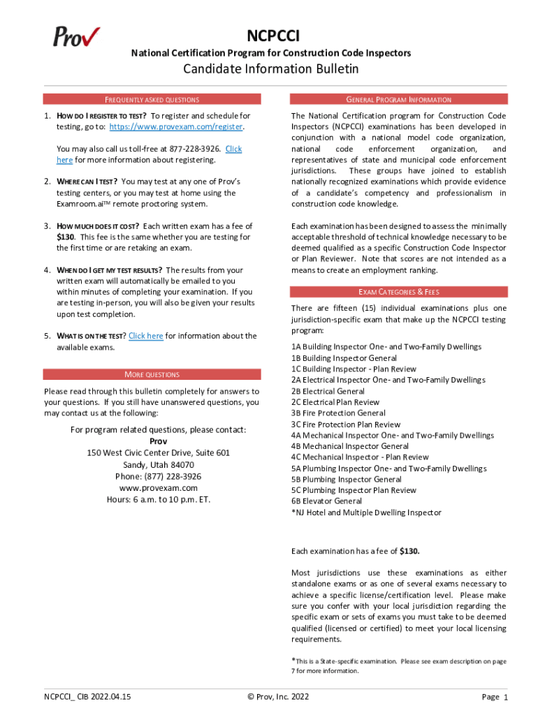 NCP CCI National Certification Program for Construction Code InspectorsCandidate Information Bulletin FREQUENTLY ASKED QUESTIONSGENERAL PROGRAM INFORMATION1. HOW DO I REGISTER TO TEST? To register