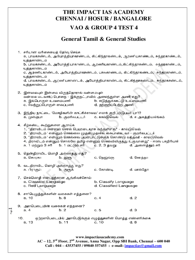 THE IMPACT IAS ACADEMY CHENNAI / HOUR / BANGALORE VAN & GROUP 4 TEST 4Page1General Tamil & General Studies.impactiasacademy.com AC 12, 3 Floor, 2 Avenue, Anna Nagar, Opp SBI Bank, Chennai 600 040