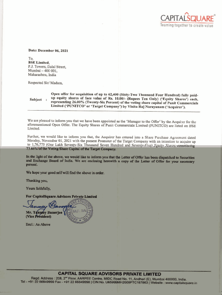 LETTER OF OFFER This document is important and requires your immediate attention This Letter of Offer (LOF) is being sent to you as the Public Shareholder (as defined below) of Unit Commercials Limited.