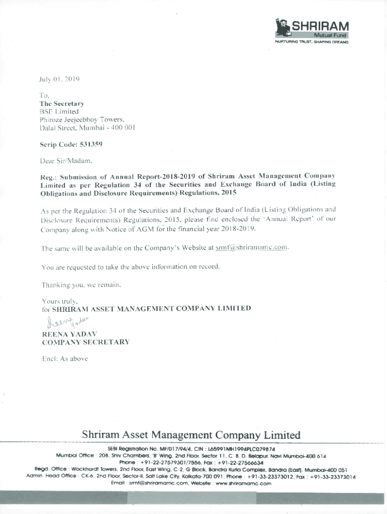 ESHRIRAMNURTURING TRUST. SHAPING DREAMSJuly01. 2019To. TheSecretaryBSE LimitedPhirozeJeejeebhoy Towers, Daley Street, MumbaiScrip400 001Code: 531359Dear Sir/Madam. Reg.: Submission of Annual Report20182019