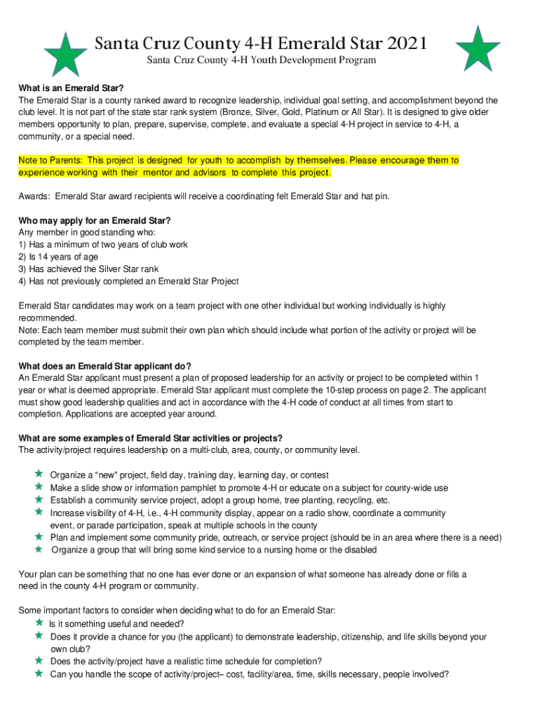 Santa Cruz County 4H Emerald Star 2021 Santa Cruz County 4H Youth Development Program What is an Emerald Star? The Emerald Star is a county ranked award to recognize leadership, individual goal setting,