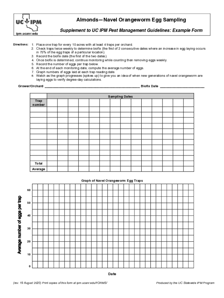 AlmondsNavel Orange worm Egg Sampling IPM.UCAR.edu Directions:Supplement to UC IPM Pest Management Guidelines: Example Form1. Place one trap for every 10 acres with at least 4 traps per orchard. 2.