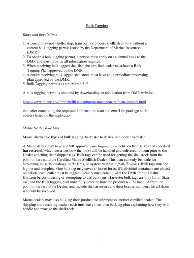 Bulk Tagging Rules and Regulations 1. A person may not handle, ship, transport, or process shellfish in bulk without a current bulk tagging permit issued by the Department of Marine Resources (DMR).