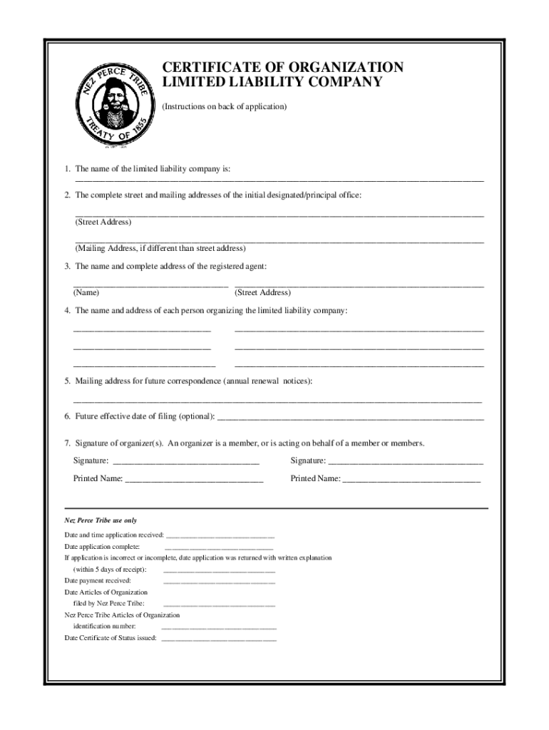 CERTIFICATE OF ORGANIZATION LIMITED LIABILITY COMPANY (Instructions on back of application)1. The name of the limited liability company is: ___ 2. The complete street and mailing addresses of the