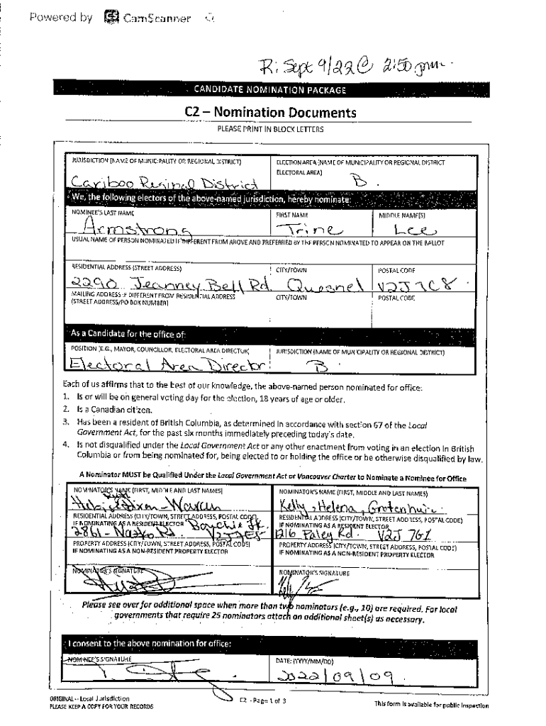 Powered byCamScanner^. Year(^ ^3)^ CANDIDATE NOMINATION PACKAGEC2 Nomination Documents PLEASE PRINT IN BLOCK LETTERSJURISDICTION (NAME OF Municipality OR REGIONAL DISTRICT)ELECTION AREA (NAME OF MUNICIPALITY/