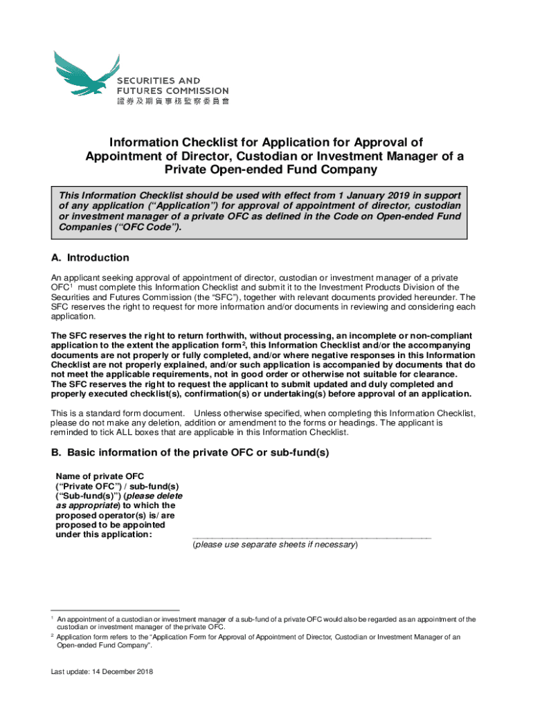Information Checklist for Application for Approval of Appointment of Director, Custodian or Investment Manager of a Private Open ended Fund Company This Information Checklist should be used with effect