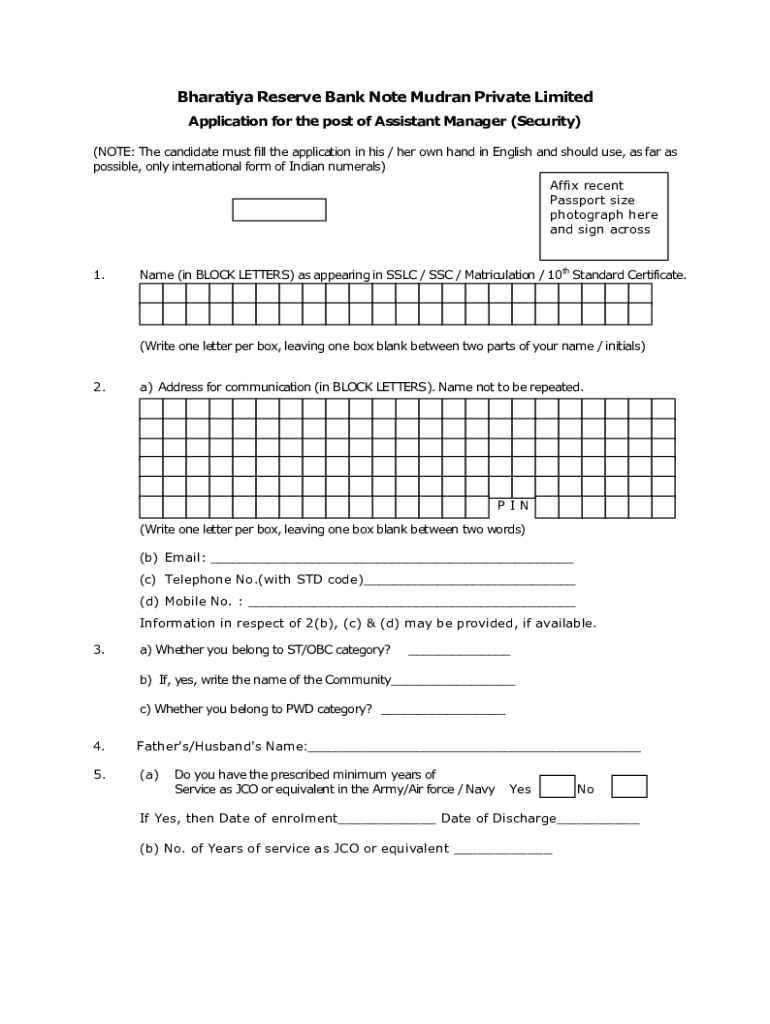 Bharat Reserve banknote Mud ran Private Limited Application for the post of Assistant Manager (Security) (NOTE: The candidate must fill the application in his / her own hand in English and should