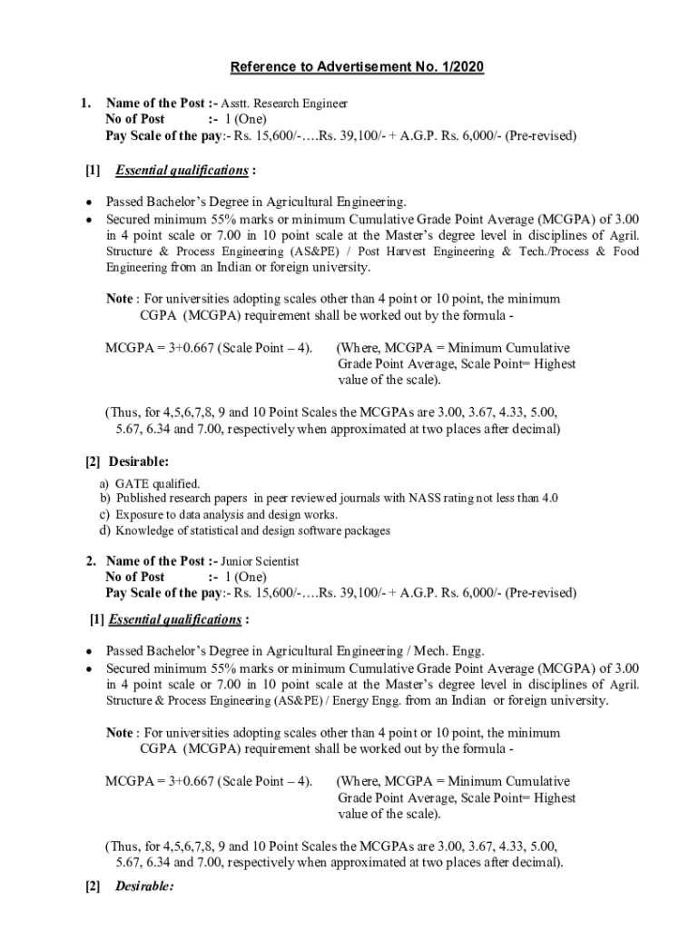 Reference to Advertisement No. 1/2020 1. Name of the Post : Asset. Research Engineer No of Post : 1 (One) Pay Scale of the pay: Rs. 15,600/. Rs. 39,100/ + A.G.P. Rs. 6,000/ (Praised)[1] Essential