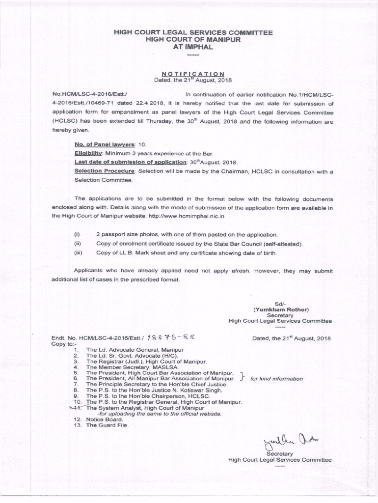 HIGH COURT LEGAL SERVICES COMMITTEE HIGH COURT OF MANIPUR AT IMPHALNOTIFICAT! Onboard No.HCM/LSC.42016/Estt./ 42016/EST.l1045971 dated 22.4.2018,LN continuation of earlier notification No.1/HIM/Licit