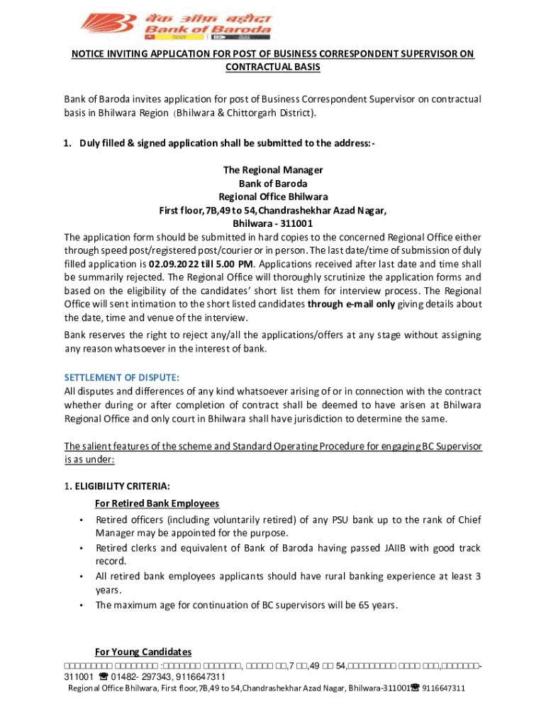 Bank of Baroda invites application for post of Business Correspondent Supervisor on contractual