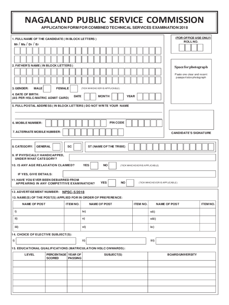 NAGALAND PUBLIC SERVICE COMMISSION APPLICATION FORM FOR COMBINED TECHNICAL SERVICES EXAMINATION 2018 (FOR OFFICE USE ONLY) ROLL NO.1. FULL NAME OF THE CANDIDATE (IN BLOCK LETTERS)/ Ms / Dr / ErMr2.