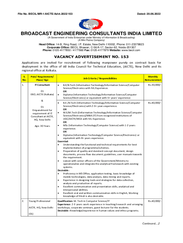 File No. CECIL/MR1/ACTE/Advt.2022/153Dated: 20.06.2022BROADCAST ENGINEERING CONSULTANTS INDIA LIMITED (A Government of India Enterprise under Ministry of Information & Broadcasting) (A Mini Patna