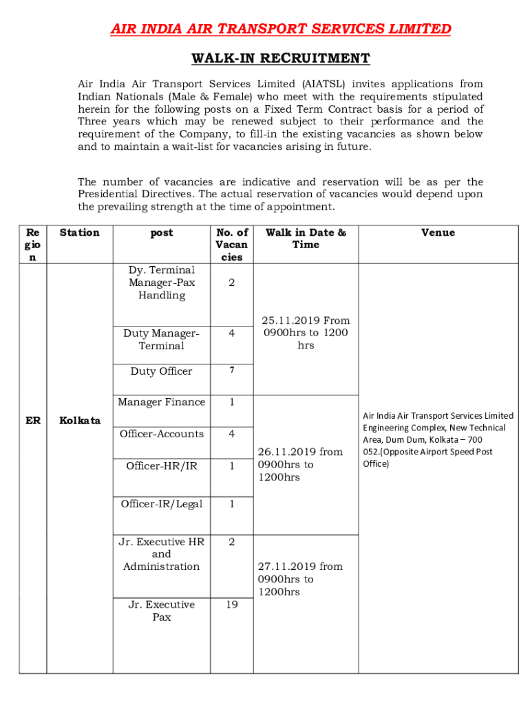 AIR INDIA AIR TRANSPORT SERVICES LIMITED WALKING RECRUITMENT Air India Air Transport Services Limited (FIATS) invites applications from Indian Nationals (Male & Female) who meet with the requirements