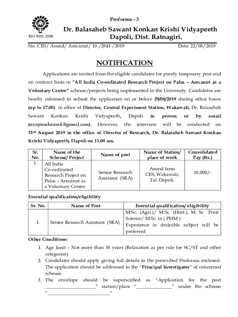 Proforma 3 ISO 90012008Dr. Balayage Savant Korean Kristi Vidyapeeth Dipole, Dist. Ratnagiri. No. CES/ And/ Recant/ 10 /2841 /2019Date: 22/08/2019NOTIFICATION Applications are invited from the eligible