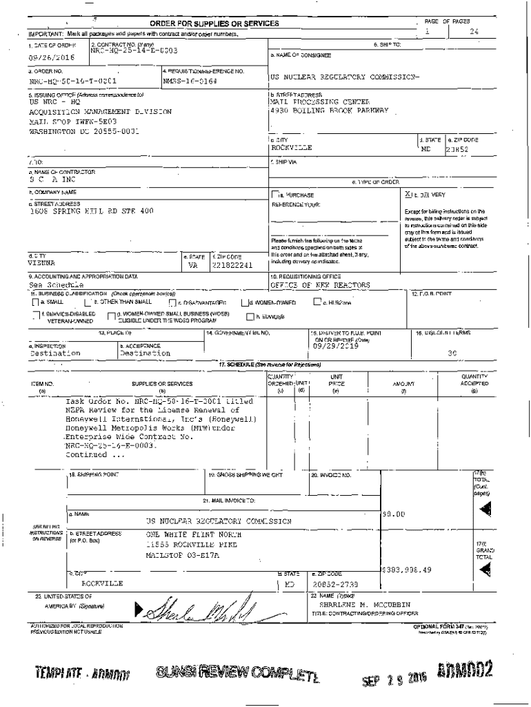 ___, .order FOR SUPPLIES OR SERVICES., IMPORTANT: Mark all packages and papers with contract and/or order numbers.2. CONTRACT NO.1. DATE OF ORDERff24a. NAME OF CONSIGNEE14. REQUISITION/REFERENCE NO.INRCHQ5016T0001I16.