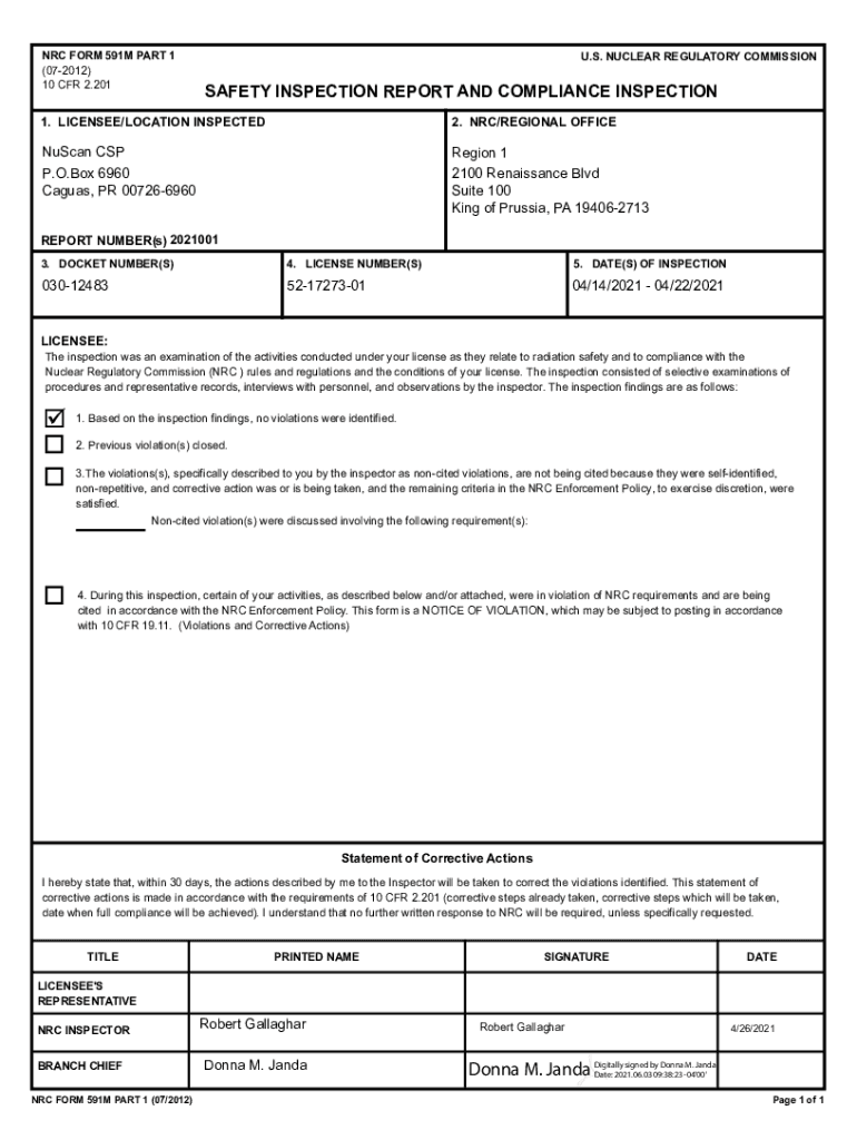 NRC FORM 591M PART 1 (072012) 10 CFR 2.201U. S. NUCLEAR REGULATORY COMMISSIONSAFETY INSPECTION REPORT AND COMPLIANCE INSPECTION1. LICENSEE/LOCATION INSPECTED2. NRC/REGIONAL OFFICENuScan Region 1 2100