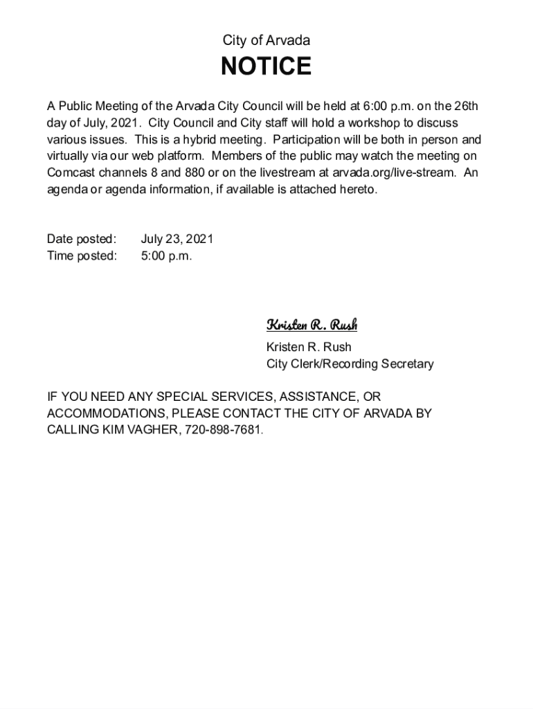City of ArvadaNOTICE A Public Meeting of the Arvada City Council will be held at 6:00 p.m. on the 26th day of July 2021. City Council and City staff will hold a workshop to discuss various issues.