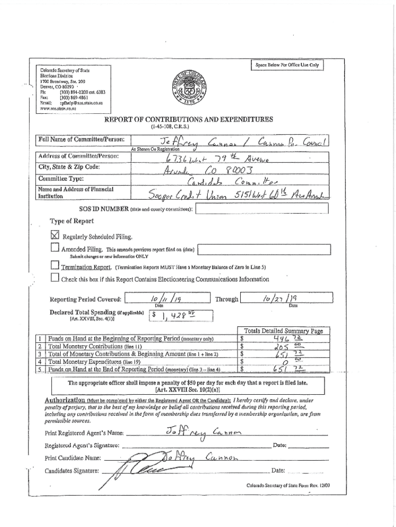 Space Below For Office Use Only\', Colorado Secretory of Slate Elec1ions Division 1700 Broadway, Ste. 200 Denver, CO 80290 pH: (303) 8942200 ex. 6383 Fax: (303) 869486 I Email: cpfhelp@sos.stale.co.us