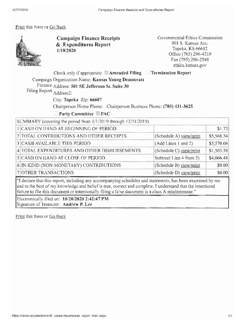 10/22/2020Campaign Finance Receipts and Expenditures Reporting this form or Go BackCampaign Finance Receipts & Expenditures Report 1110/2020Governmental Ethics Commission901 S. Kansas Ave. Topeka,