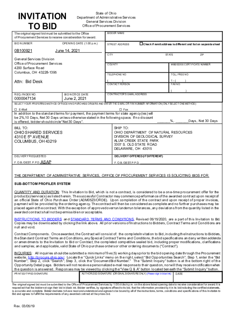 INVITATION TO Instate of Ohio Department of Administrative Services General Services Division Office of Procurement Services original signed bid must be submitted to the Office of Procurement Services