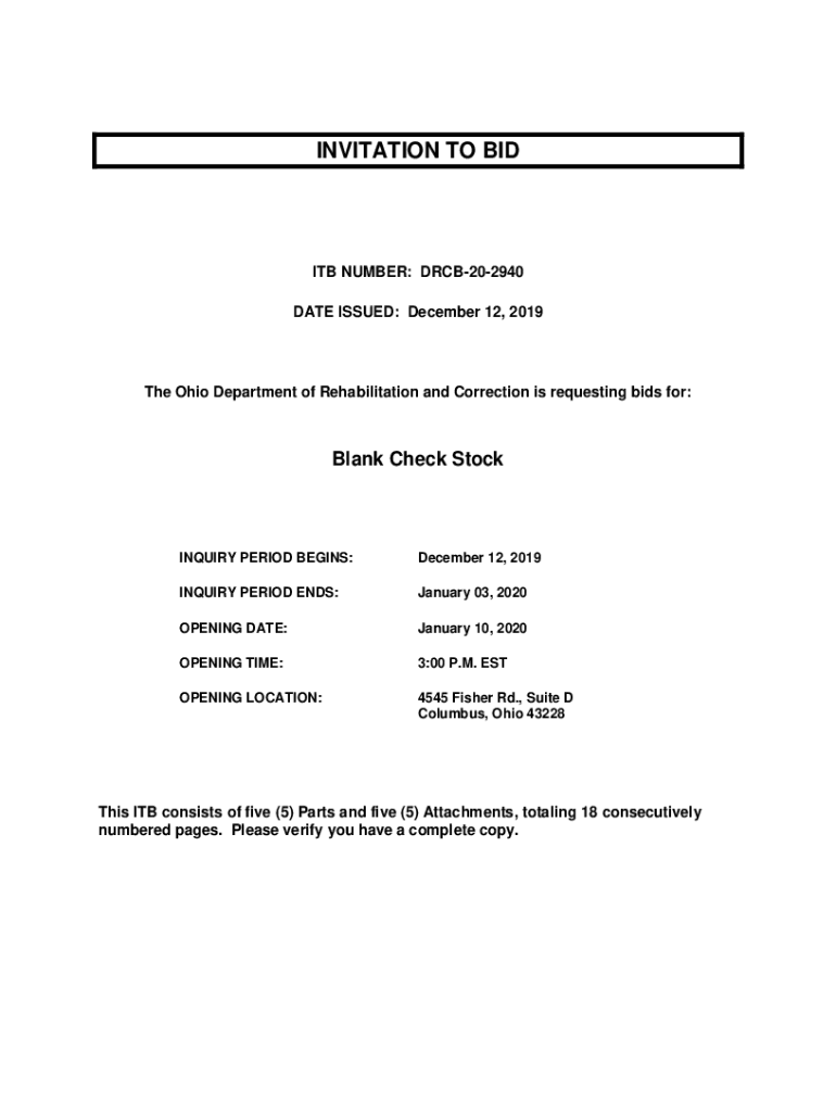 INVITATION TO BID ITB NUMBER: DRCB202940 DATE ISSUED: December 12, 2019The Ohio Department of Rehabilitation and Correction is requesting bids for:Blank Check StockINQUIRY PERIOD BEGINS:December 12,