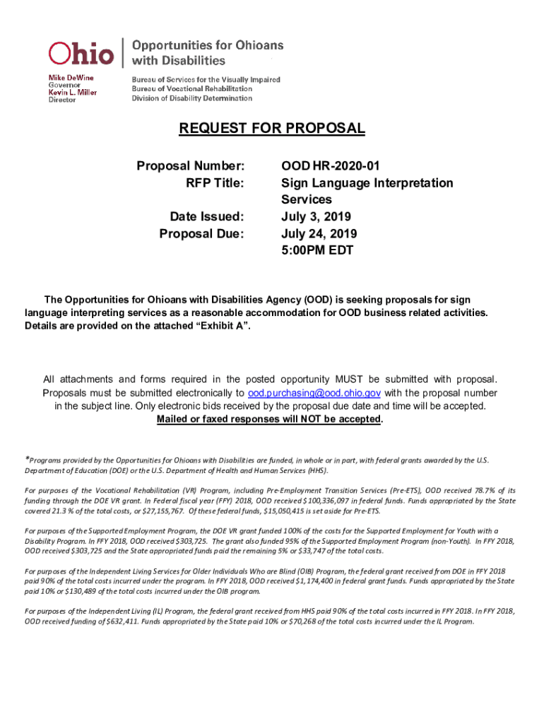 REQUEST FOR PROPOSAL Number: RFP Title: Date Issued: Proposal Due:GOOD HR202001 Sign Language Interpretation Services July 3, 2019, July 24, 2019 5:00PM Edith Opportunities for Ohioans with Disabilities