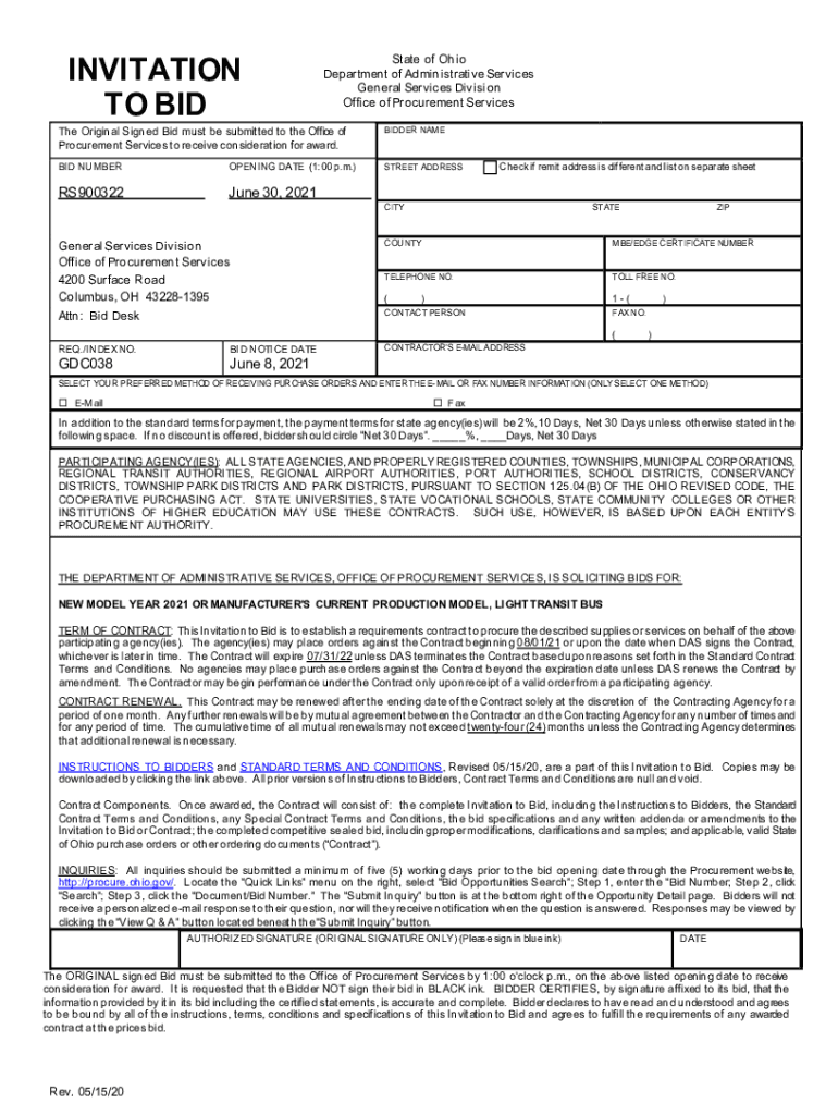 INVITATION TO Instate of Ohio Department of Administrative Services General Services Division Office of Procurement Services Original Signed Bid must be submitted to the Office of Procurement Services