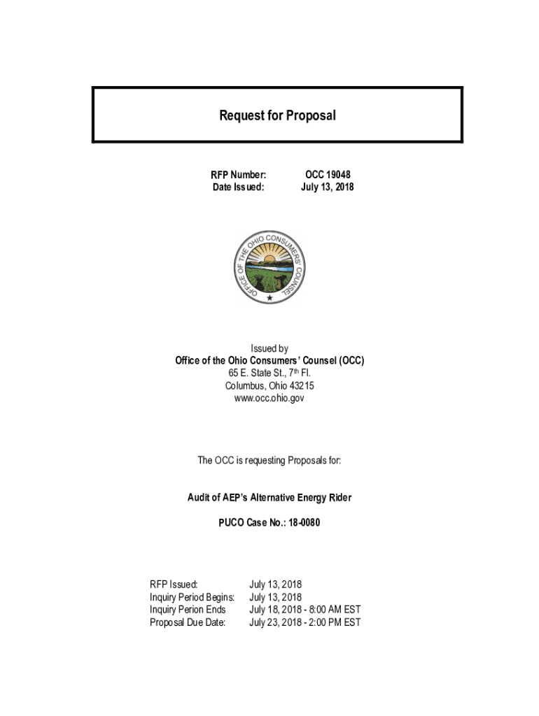 Request for Proposal RFP Number: Date Issued:OCC 19048 July 13, 2018Issued by Office of the Ohio Consumers Counsel (OCC) 65 E. State St., 7th Fl. Columbus, Ohio 43215 www.occ.ohio.govThe OCC is requesting