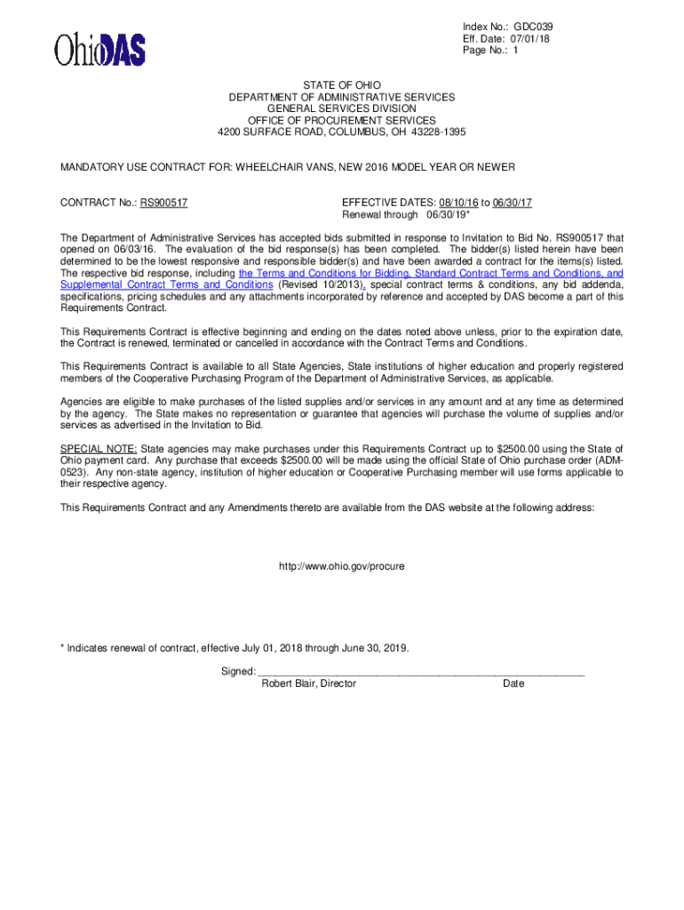 Index No.: GDC039 Eff. Date: 07/01/18-Page No.: 1 STATE OF OHIO DEPARTMENT OF ADMINISTRATIVE SERVICES GENERAL SERVICES DIVISION OFFICE OF PROCUREMENT SERVICES 4200 SURFACE ROAD, COLUMBUS, OH 432281395