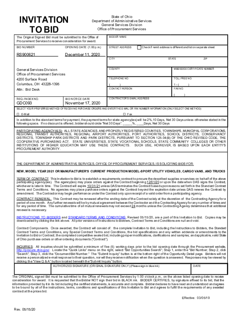 INVITATION TO Instate of Ohio Department of Administrative Services General Services Division Office of Procurement Services Original Signed Bid must be submitted to the Office of Procurement Services