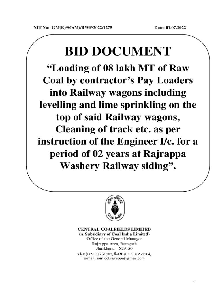 NIT No: GM(R)/SO(M)/RAP/2022/1275Date: 01.07.2022BID DOCUMENT Loading of 08 lakh MT of Raw Coal by contractors Pay Loaders into Railway wagons including levelling and lime sprinkling on the top of