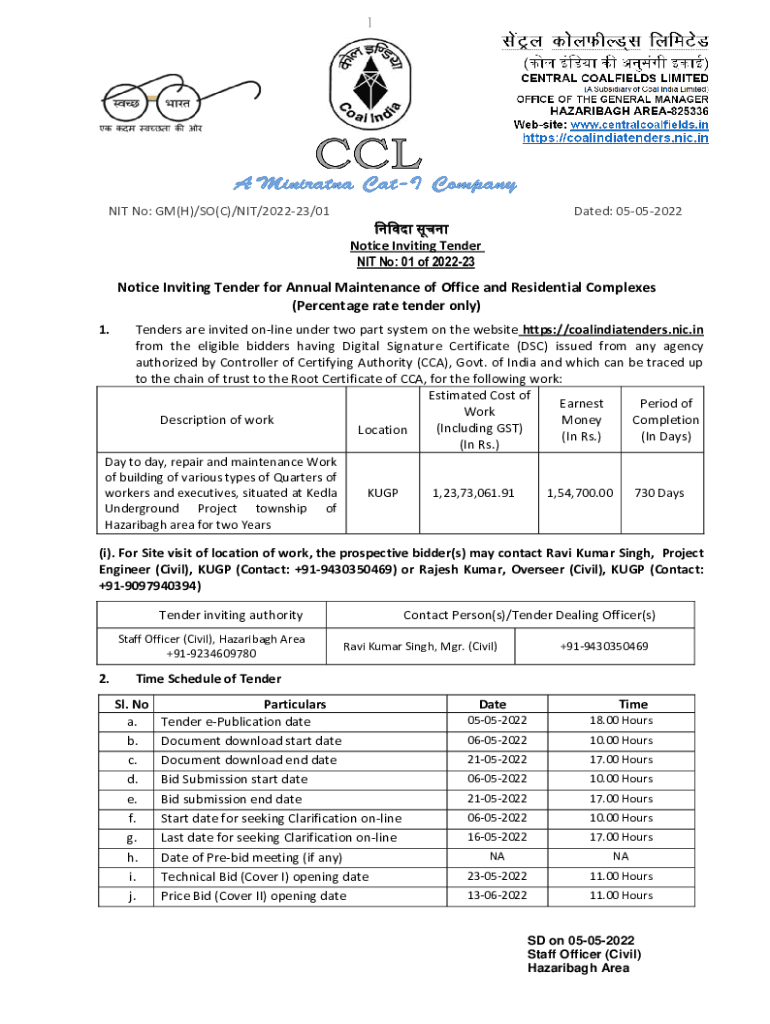 1NIT No: GM(H)/SO(C)/NIT/202223/01 628Dated: 05052022 Notice Inviting Tender NIT No: 01 of 202223Notice Inviting Tender for Annual Maintenance of Office and Residential Complexes (Percentage rate