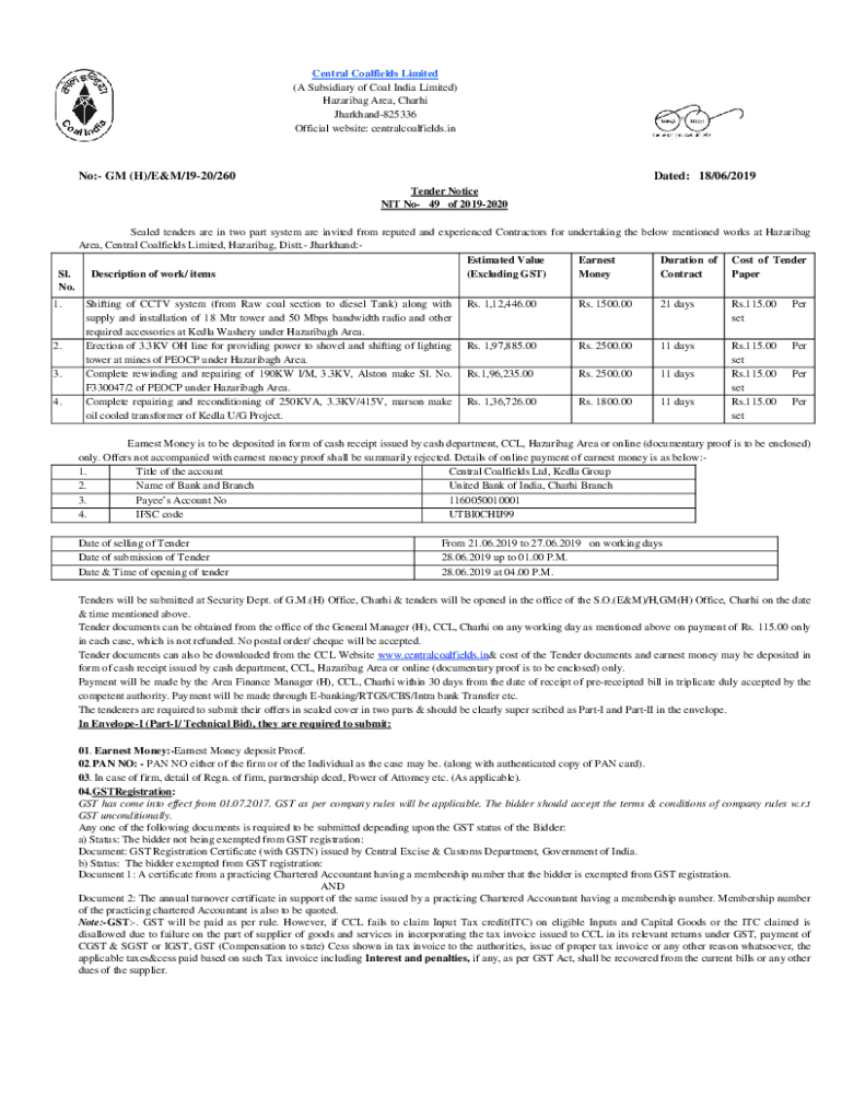 Central Coalfields Limited (A Subsidiary of Coal India Limited) Hazarding Area, Char hi Jharkhand825336 Official website: central coalfields.into: GM (H)/E&M/1920/260Dated: 18/06/2019 Tender Notice