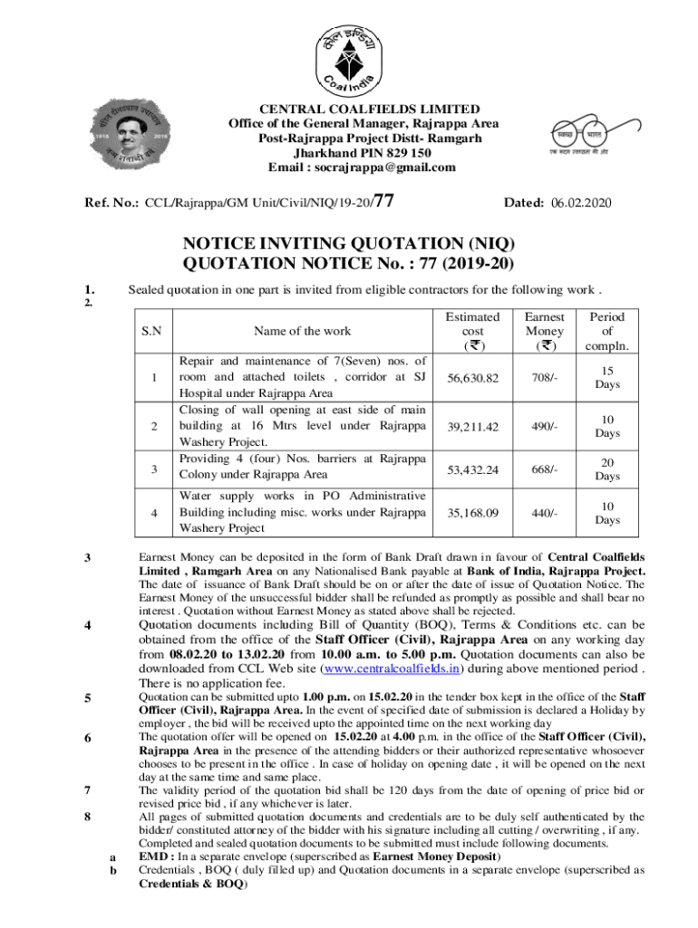 CENTRAL COALFIELDS LIMITED Office of the General Manager, Harappa Area PostRajrappa Project Dist Rampart Jharkhand PIN 829 150 Email : socrajrappa@gmail.com Ref. No.: CCL/Harappa/GM Unit/Civil/IQ/1920/77Dated: