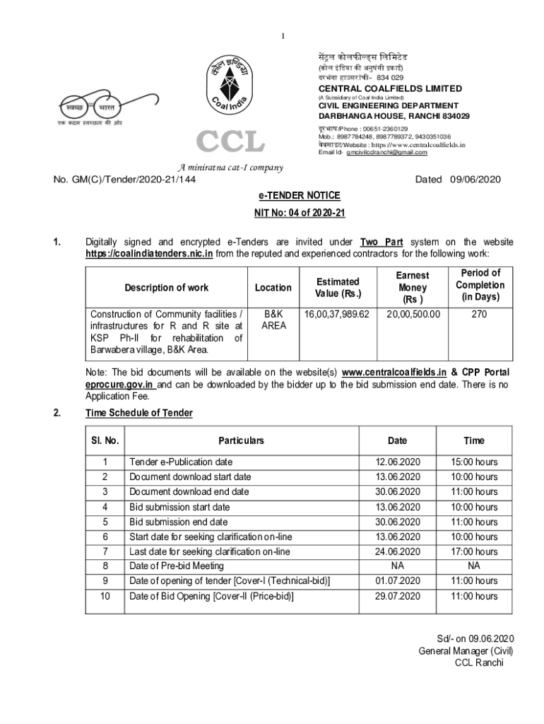 1 () 834 029CENTRAL COALFIELDS LIMITED (A Subsidiary of Coal India Limited)CIVIL ENGINEERING DEPARTMENT DARSHAN HOUSE, RANCHI 834029CCL/Phone : 006512360129 Mob.: 8987784248, 8987789372, 9430351036