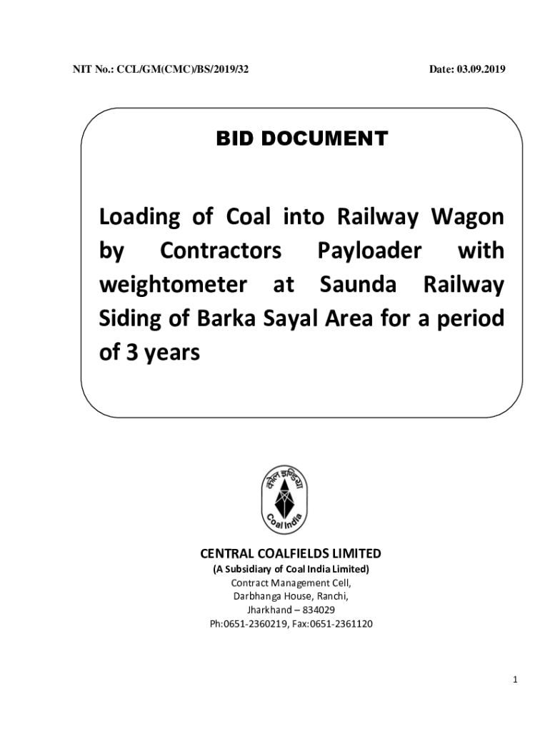 NIT No.: CCL/GM(CMC)/BS/2019/32Date: 03.09.2019BID DOCUMENTLoading of Coal into Railway Wagon