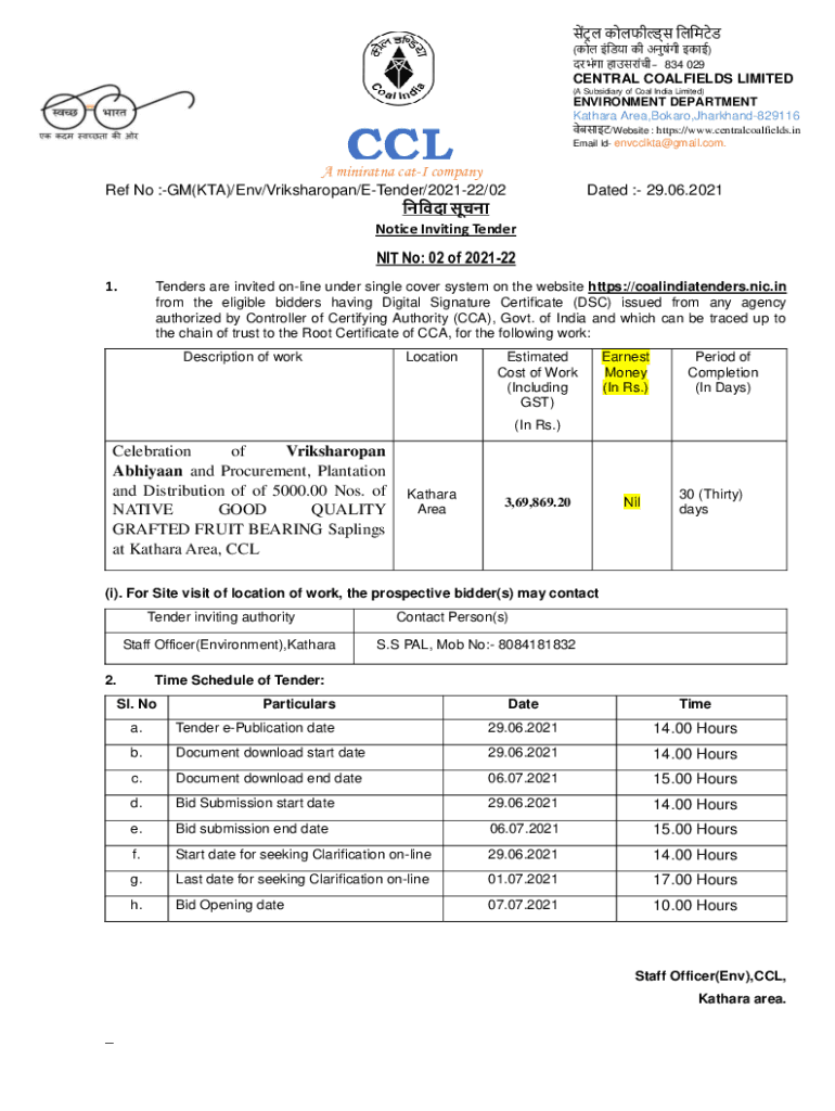 () 834 0291CENTRAL COALFIELDS LIMITED (A Subsidiary of Coal India Limited)ENVIRONMENT DEPARTMENT Sahara Area, Board,Jharkhand829116 RACIAL/Website : https://www.centralcoalfields.in Email I'd envcclkta@gmail.com.comA