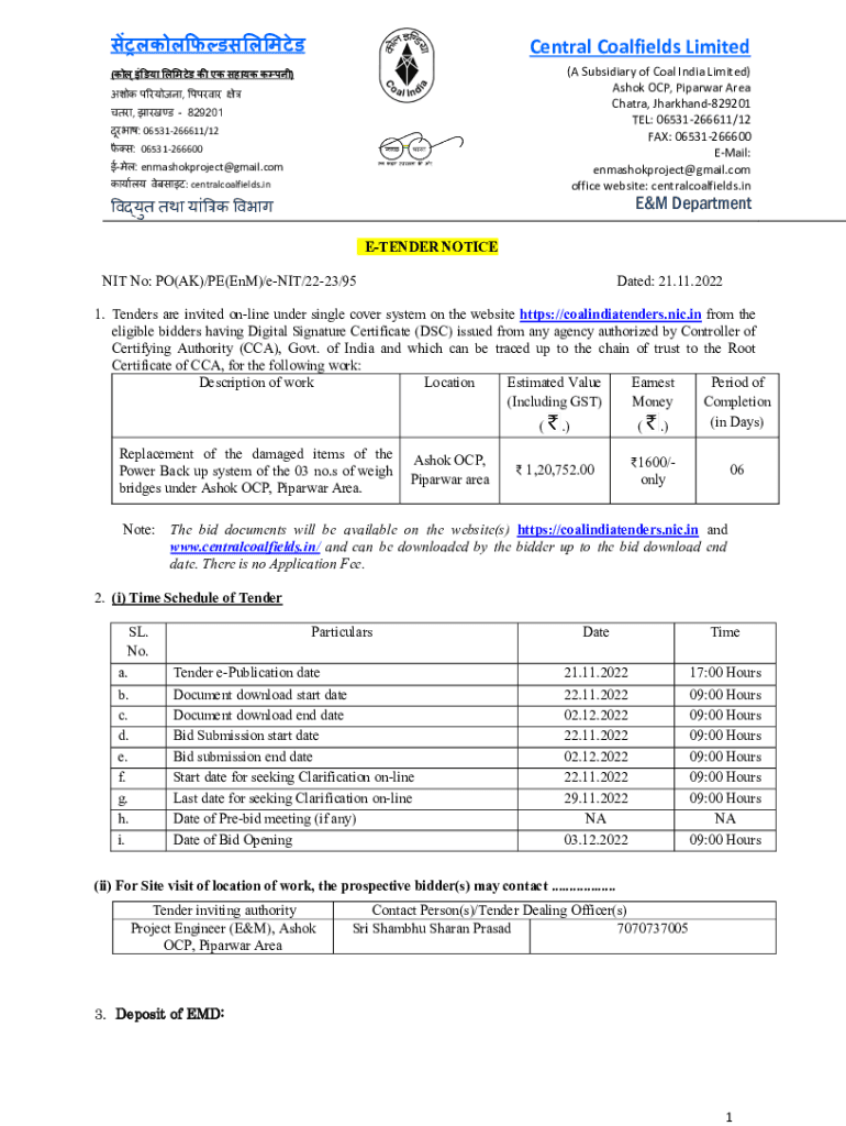 Central Coalfields Limited (A Subsidiary of Coal India Limited) Ashok OCP, Riparian Area Chakra, Jharkhand829201 TEL: 06531266611/12 FAX: 06531266600 Email: enmashokproject@gmail.com office website: