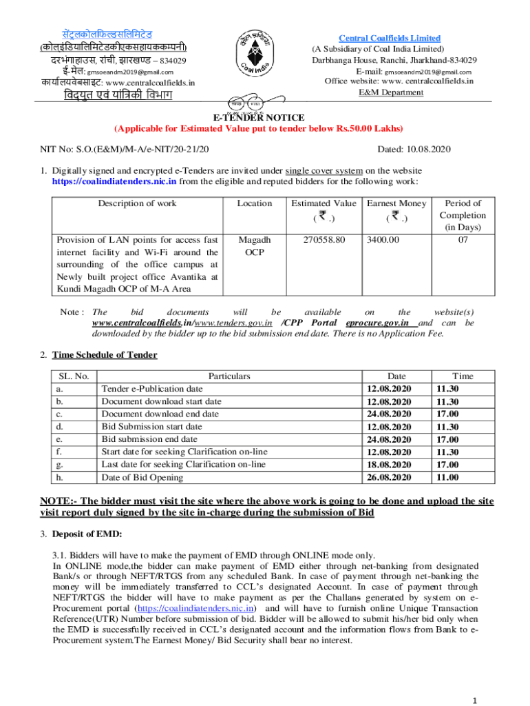 Central Coalfields Limited (A Subsidiary of Coal India Limited) Darshan House, Ranchi, Jharkhand834029 Email: gmsoeandm2019@gmail.com Office website: WWW. Central coalfields.in E&M Department(), 834029