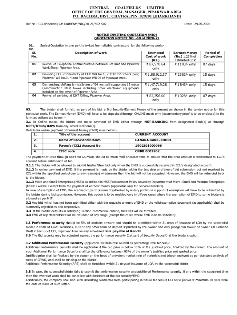 CENTRAL COALFIELDS LIMITED OFFICE OF THE GENERAL MANAGER, RIPARIAN AREA PO: BAC HRA, DIST: CHAKRA, PIN: 829201 (JHARKHAND) Ref No.: CCL/Riparian/GM Unit/E&M/IQ/2021/502507Date: 29.09.2020NOTICE INVITING