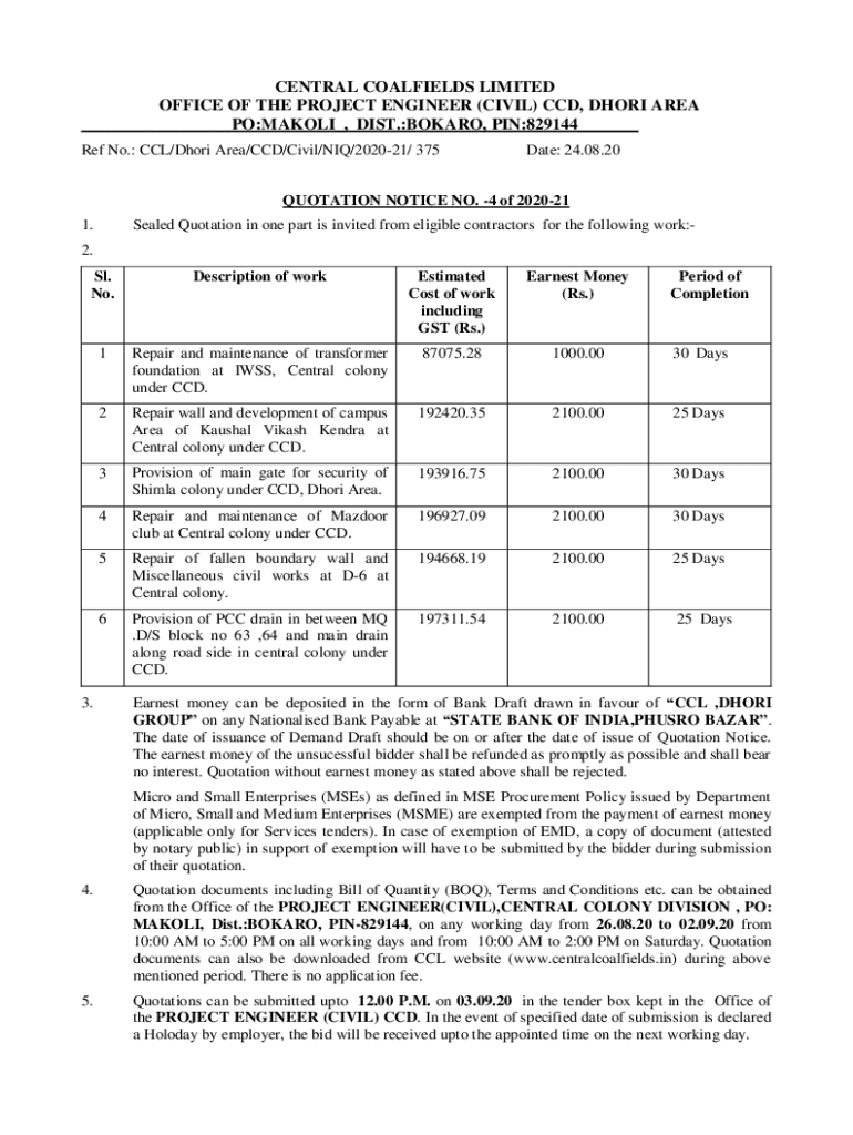 CENTRAL COALFIELDS LIMITED OFFICE OF THE PROJECT ENGINEER (CIVIL) CCD, DHOTI AREA PO:MALI_, DIST.:BOARD, PIN:829144___ Ref No.: CCL/Dhoti Area/CCD/Civil/IQ/202021/ 375Date: 24.08.20QUOTATION NOTICE