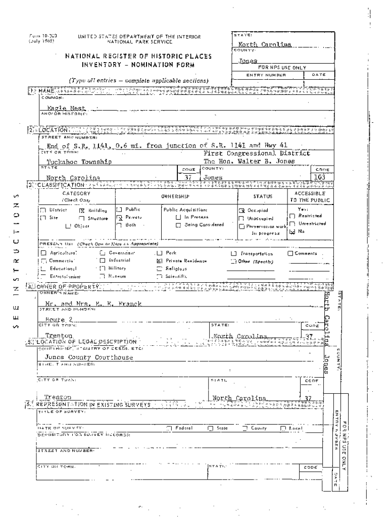 Form 10300 1969)STATE:United Stales DEPARTMENT OF THE INTERIOR NATIONAL PARK SERVICEJulyNorth Carolina COUNTY, national Register OF HISTORIC PLACES INVENTORY NOMINATION FORM. Jones FOR NPS USE ONLY