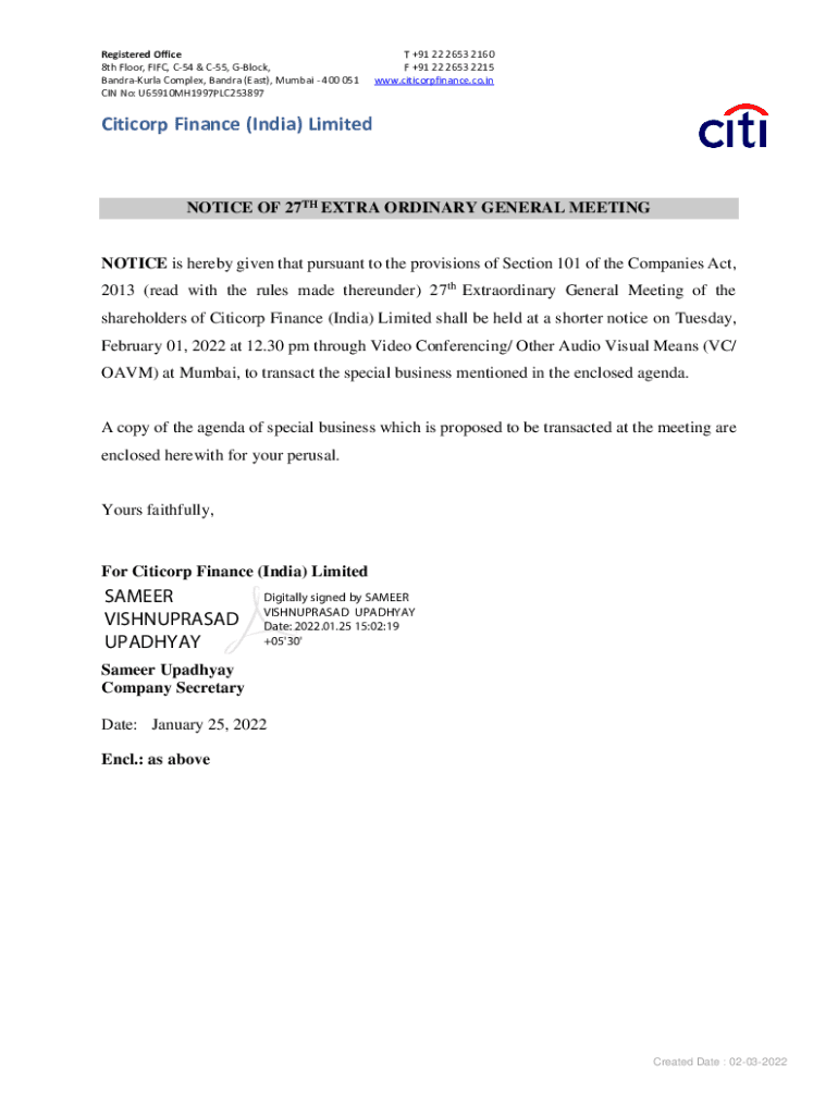 Get the free Notice-of-27th-EGM.pdf - Citicorp Finance (India) Limited
